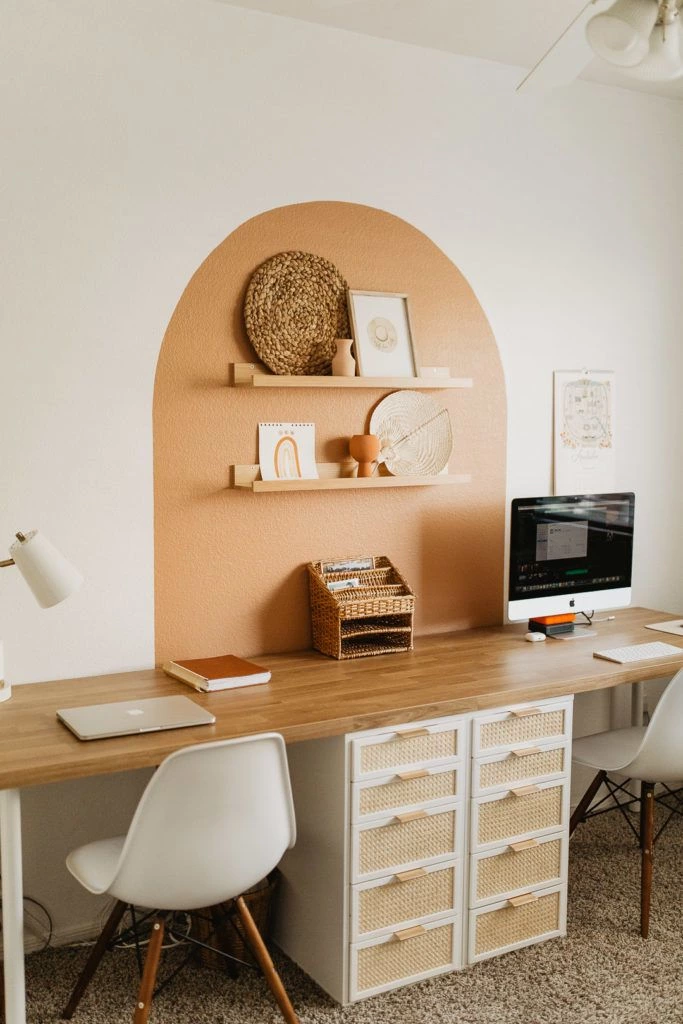 If you’re a fellow boho home decor lover, this warm-toned desk setup is a must-try. Plus, it’s perfect for couples who work from home and don’t have enough space for separate offices.