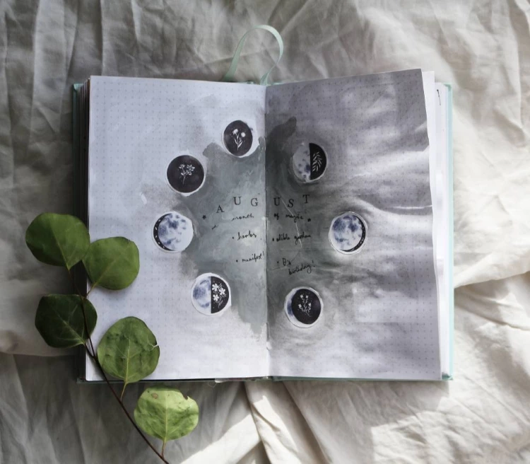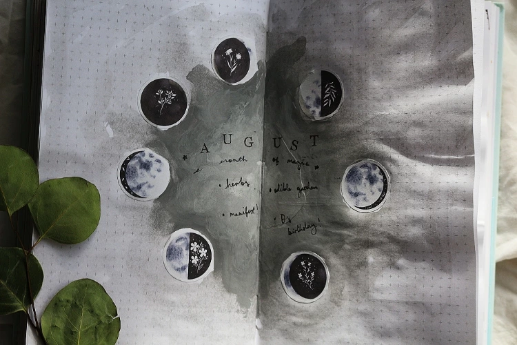 The title page I created was super simple – very much minimal effort required. A dash of watercolour paint in the background, some letter stamps I live off and these simply gorgeous moon phase stickers.