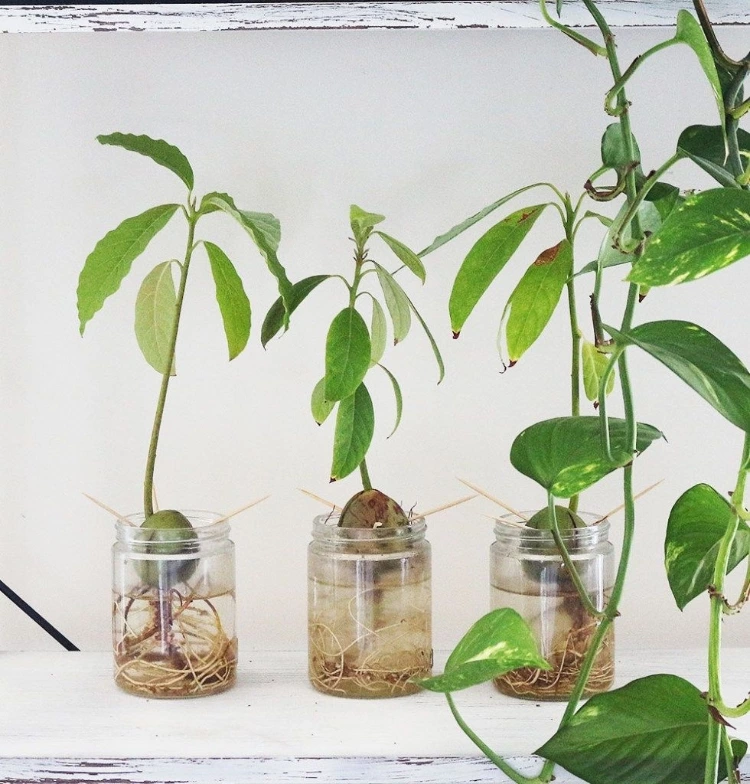 A budget-friendly way to display plants is to upcycle old bottles and jars into little propagation stations! Avocados are one of my favourite plants to do this with (check out my tutorial here to learn how to propagate them!)