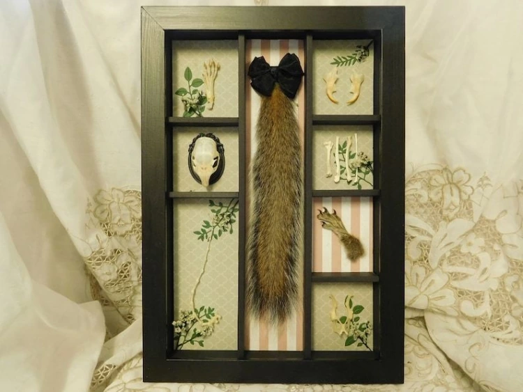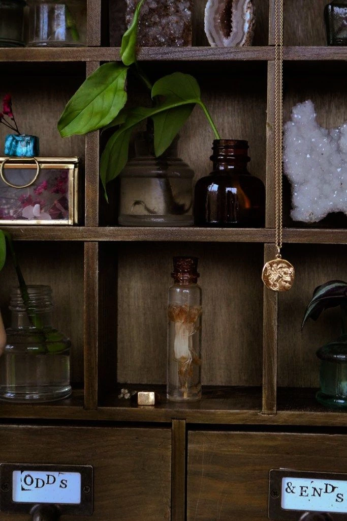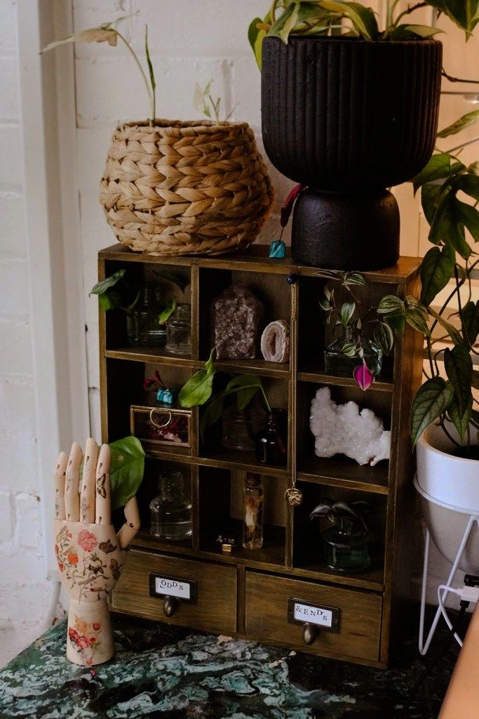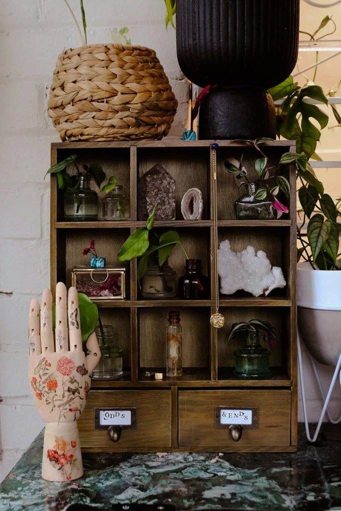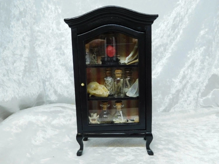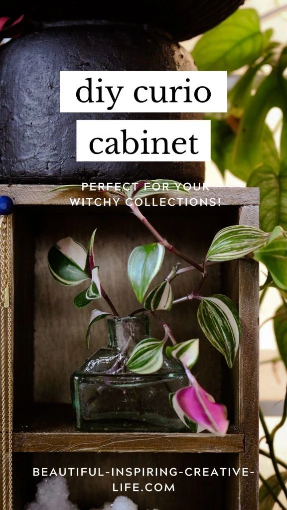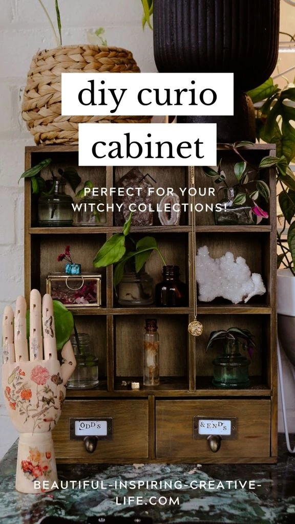 A curio cabinet is quite literally a little display cabinet for sharing your curious collections. These can be practical things (like crystals or vintage odds and ends) – or they can be quirky, magical things.