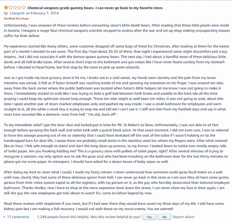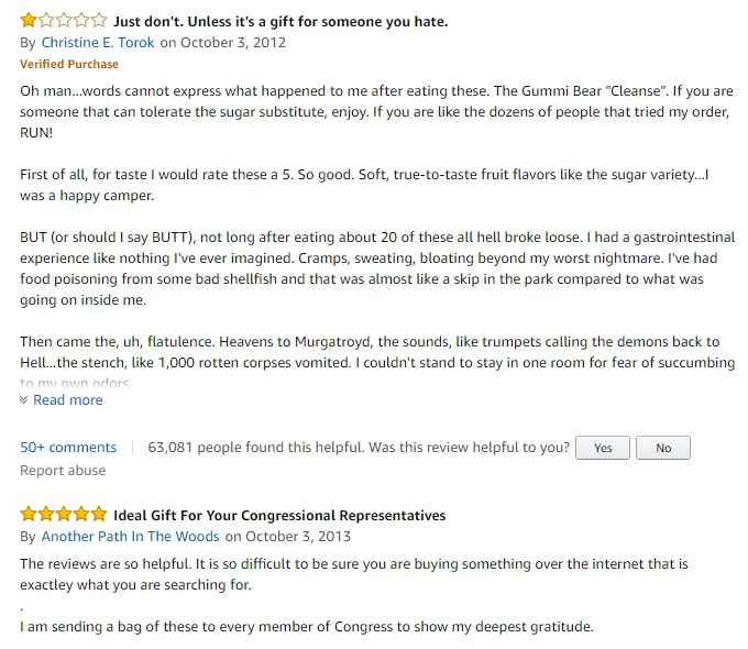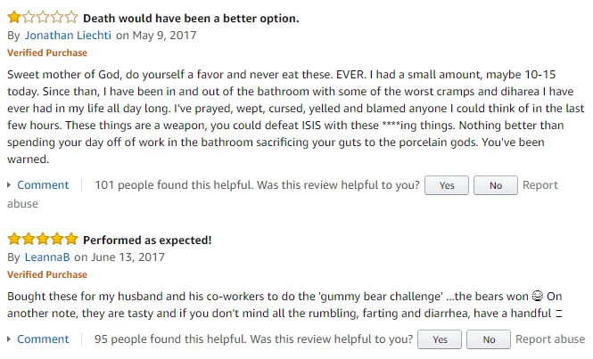 These gummy bears may, at first, seem like a lovely gift . . . but read some of the reviews here. Apparently, they’re liable to give your digestive system . . . issues. The good thing is, though, that they taste nice first! Want to see some of the reviews? Let’s go!