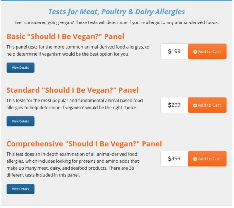 Essentially, what these panels do is test you for animal-derived food allergies so you can really see if – healthwise – moving to a completely plant based diet is actually going to be beneficial for you. There are 3 different panels, from Basic to Comprehensive, each one going more in depth and testing you for more allergies.