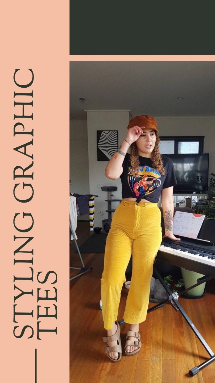 My first favourite way to style a graphic tee is just to tie it off at the waist with some comfy pants. I love this combo because . . . well, the pants are from Thrills Co. And they’re one of my favourite stores I’ve discovered in Australia. Ethical, comfy and cute? The holy trinity. (I’ve actually featured these same trousers in another OOTD that you should definitely check out!)