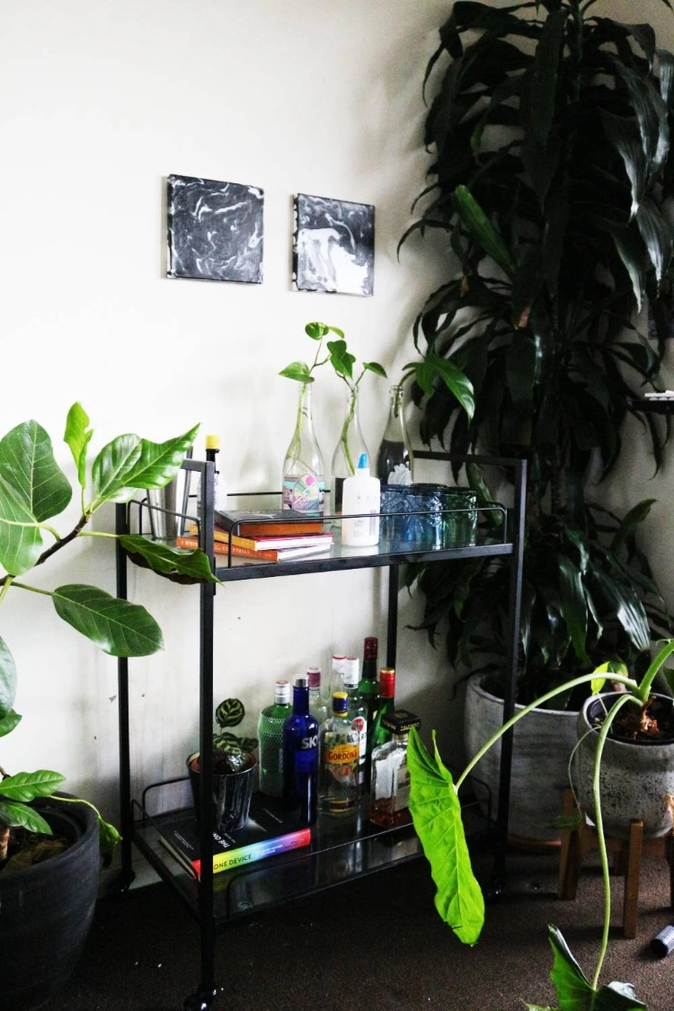 For Christmas, one of the gifts I got him was this minimal glass bar cart (similar), so I styled it with the DIY plant pot I made him, some cocktail recipe books and (of course) alcohol!