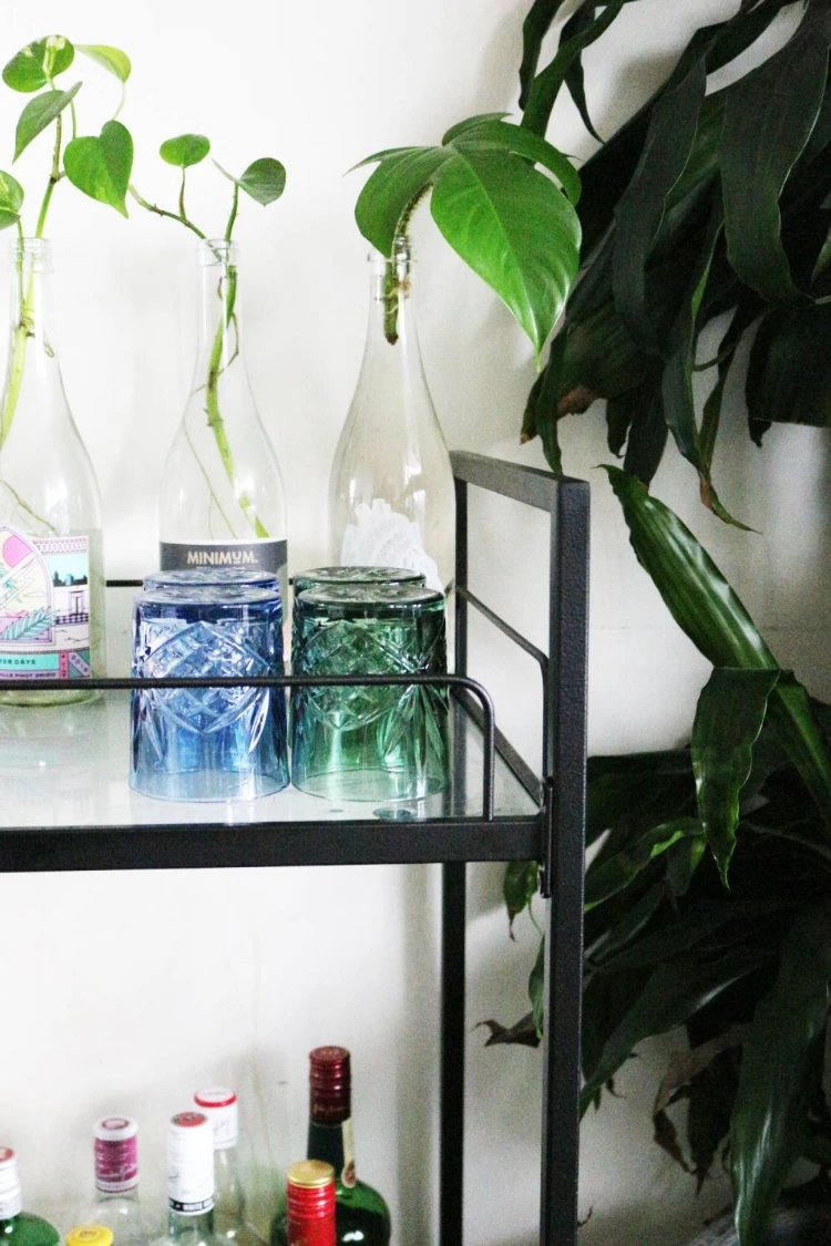One of my favourite ways to propagate and display plants is in old alcohol bottles, so I put some Devils Ivy and Philodendron cuttings in wine bottles. Is this room an urban jungle? I think so!