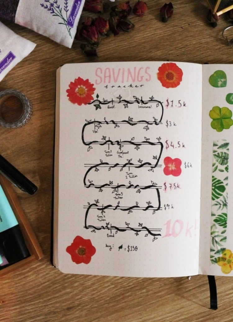 In an effort to get myself out of the crippling depression of money-induced stress, I decided to just organise the shit out of it. A roadmap of “how I have to get my ass in gear”, if you will. And that brings us to the first of our spreads: my savings tracker.