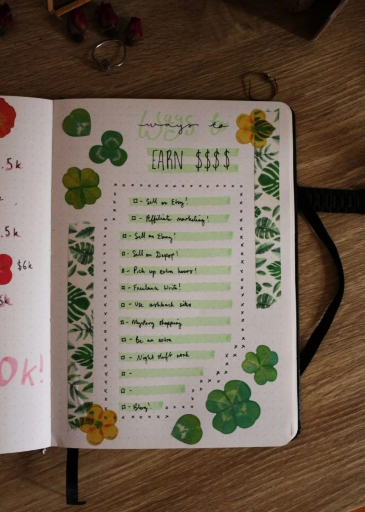 Next up is a spread that felt like a natural fit next to the first one – and that’s ways to make money (on top of having a job). For me, it was just helpful to jot down some ideas and things to start looking into. Freelancing, in particular, is something I’m going to be seriously investigating over the next months. If anyone has any tips on getting started with that, please throw them my way!