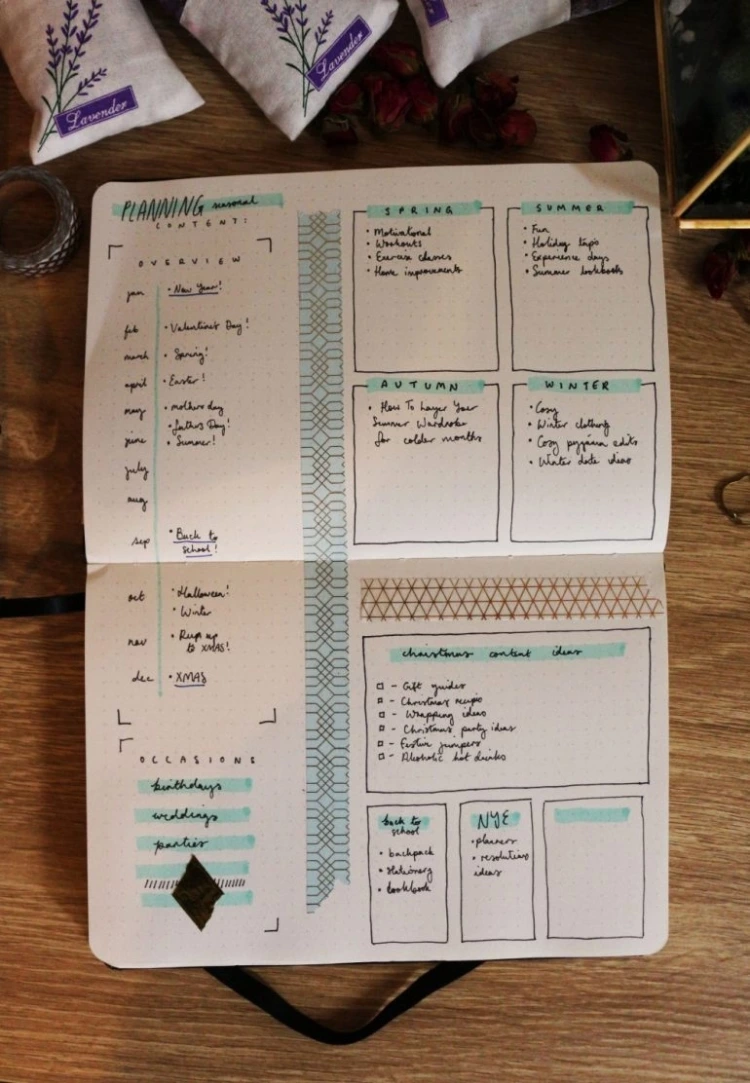 My third and final pre-June bullet journal spread is also geared at the cash money, but more from a blog perspective. Basically, to make sure I can really reap the benefits of seasonal content, I have realised that I should really get my ass in gear and actually plan it. So if I start happening to place Christmas puns in my writing, you know where that’s coming from.
